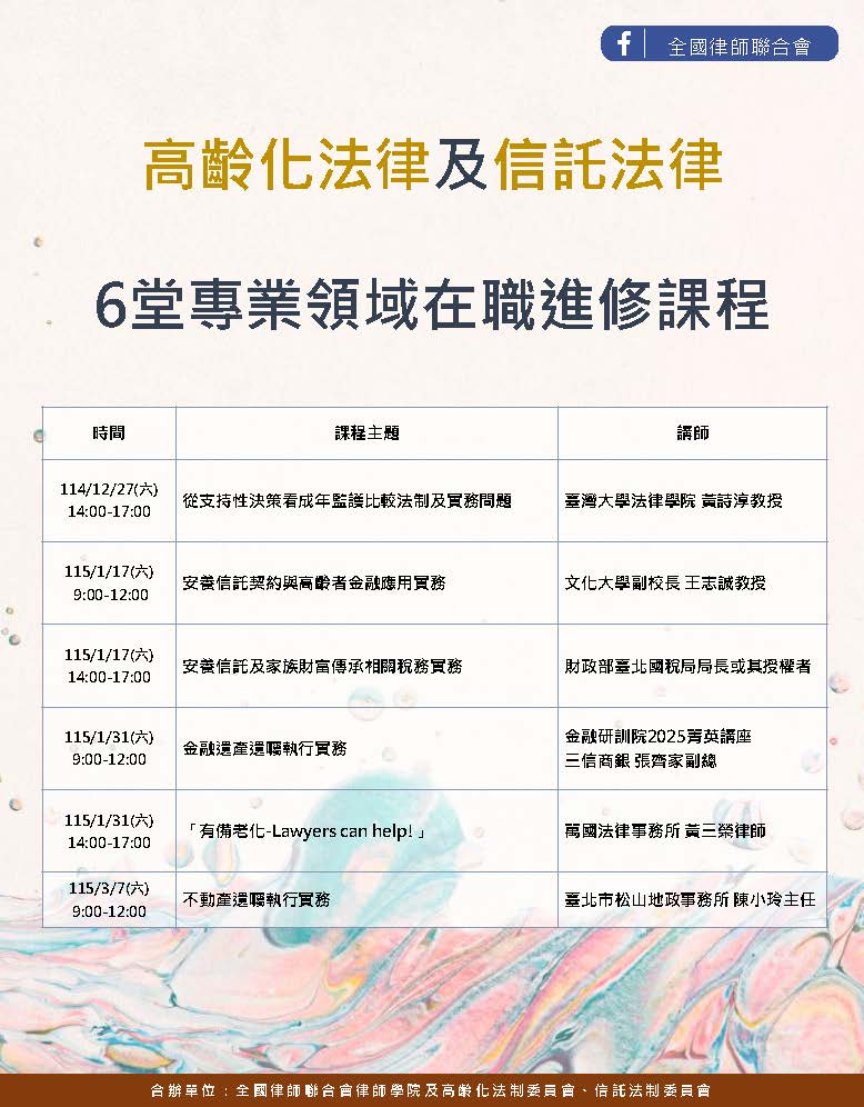 轉知~全國律師聯合會定於114年12月27日至115年3月7日(星期六)間舉辦「高齡化法律」及「信託法律」6堂專業領域在職進修課程,歡迎踴躍報名參加。