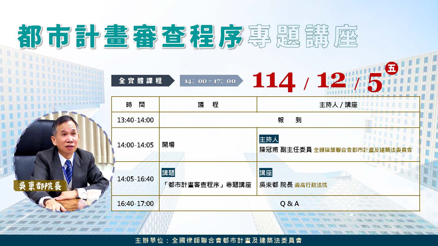 轉知~全國律師聯合會都市計畫及建築法委員會定於114年12月5日(星期五)下午14:00-17:00假本會會議室(台北市中正區忠孝西路一段4號7樓C室) 舉辦「都市計畫審查程序」專題講座,歡迎踴躍報名參加。