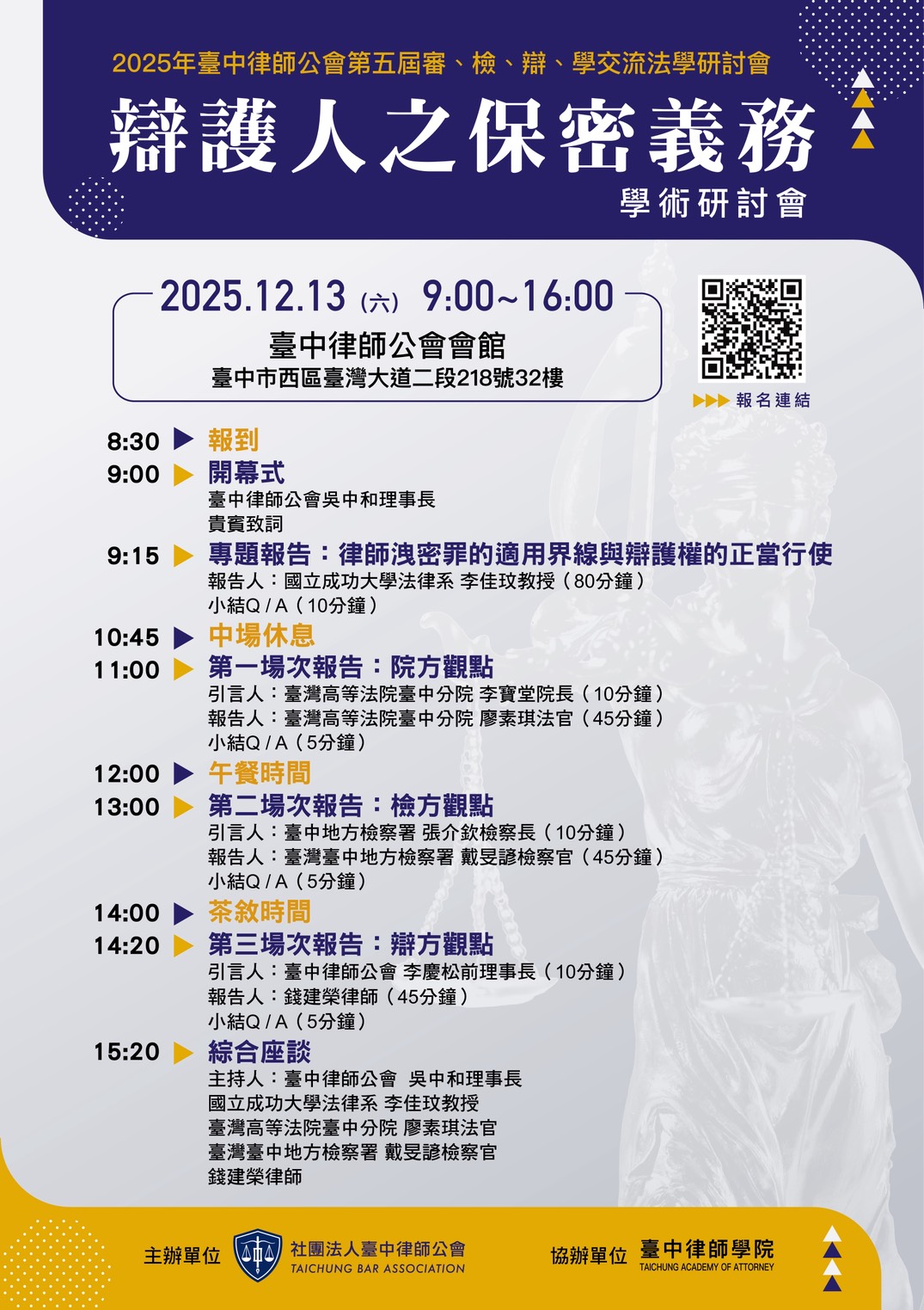 【課程通知】114年12月13日「2025年臺中律師公會第五屆審、檢、辯、學研討會--辯護人之保密義務」,歡迎踴躍報名參加。