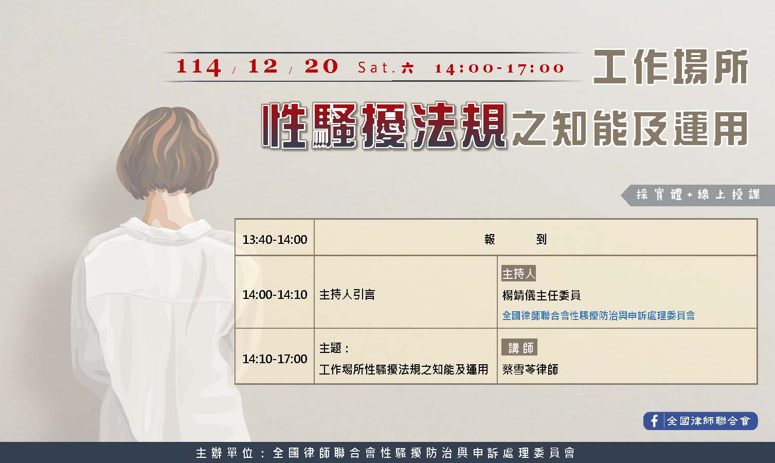 轉知~全律會性騷擾防治與申訴處理委員會定於114年12月20日(星期六)下午2時至5時假該會會議室(台北市中正區忠孝西路一段4號7樓C室)舉辦「工作場所性騷擾法規之知能及運用」在職進修,請踴躍報名參加。