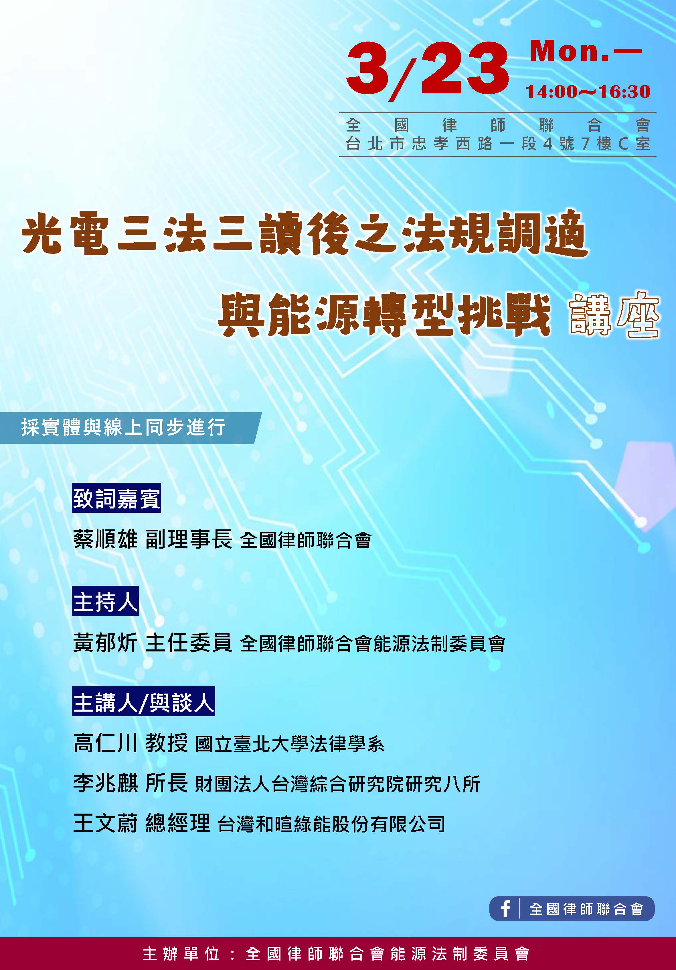 轉知~全律會「光電三法三讀後之法規調適與能源轉型挑戰」講座