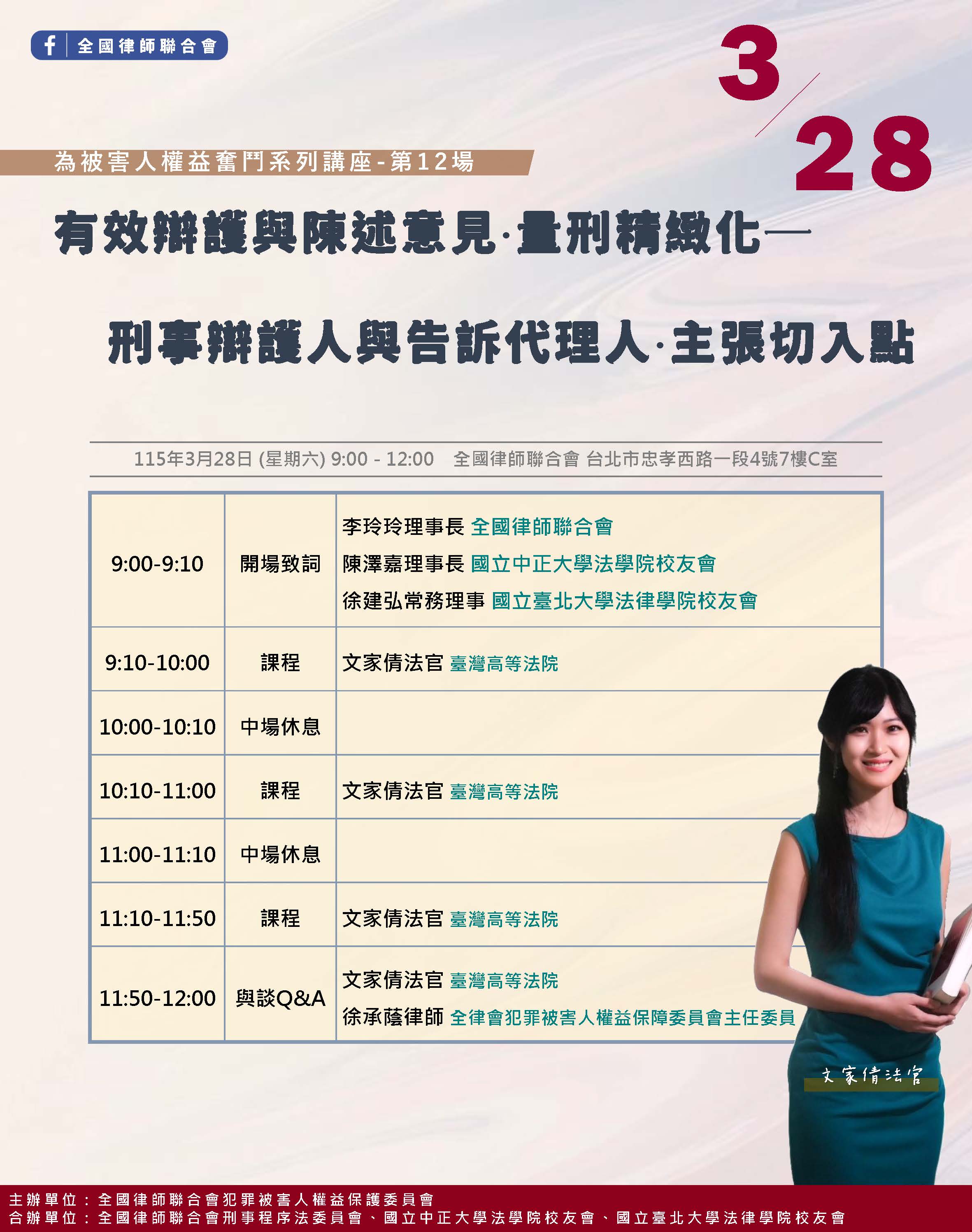 轉知~全律會115年3月28日舉辦《為被害人權益奮鬥系列講座:第12場》─「有效辯護與陳述意見‧量刑精緻化─刑事辯護人與告訴代理人‧主張切入點」,歡迎踴躍報名參加。