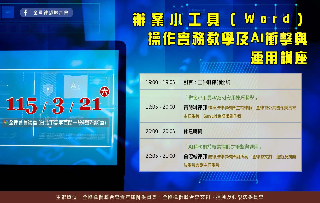 轉知~全律會115年3月21日下午舉辦「辦案小工具(Word)操作實務教學及AI衝擊與運用」講座,歡迎踴躍報名參加。
