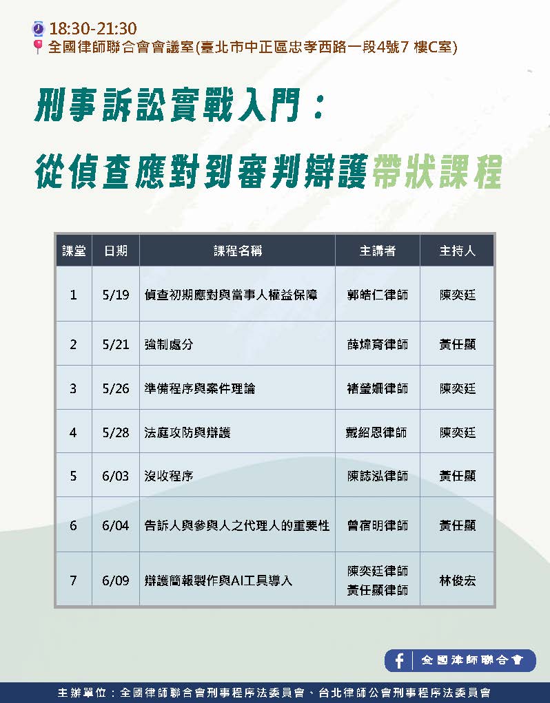 轉知~全律會定於115年5月至6月間與台北律師公會共同主辦「刑事訴訟實戰入門:從偵查應對到審判辯護」帶狀課程,歡迎踴躍報名參加。