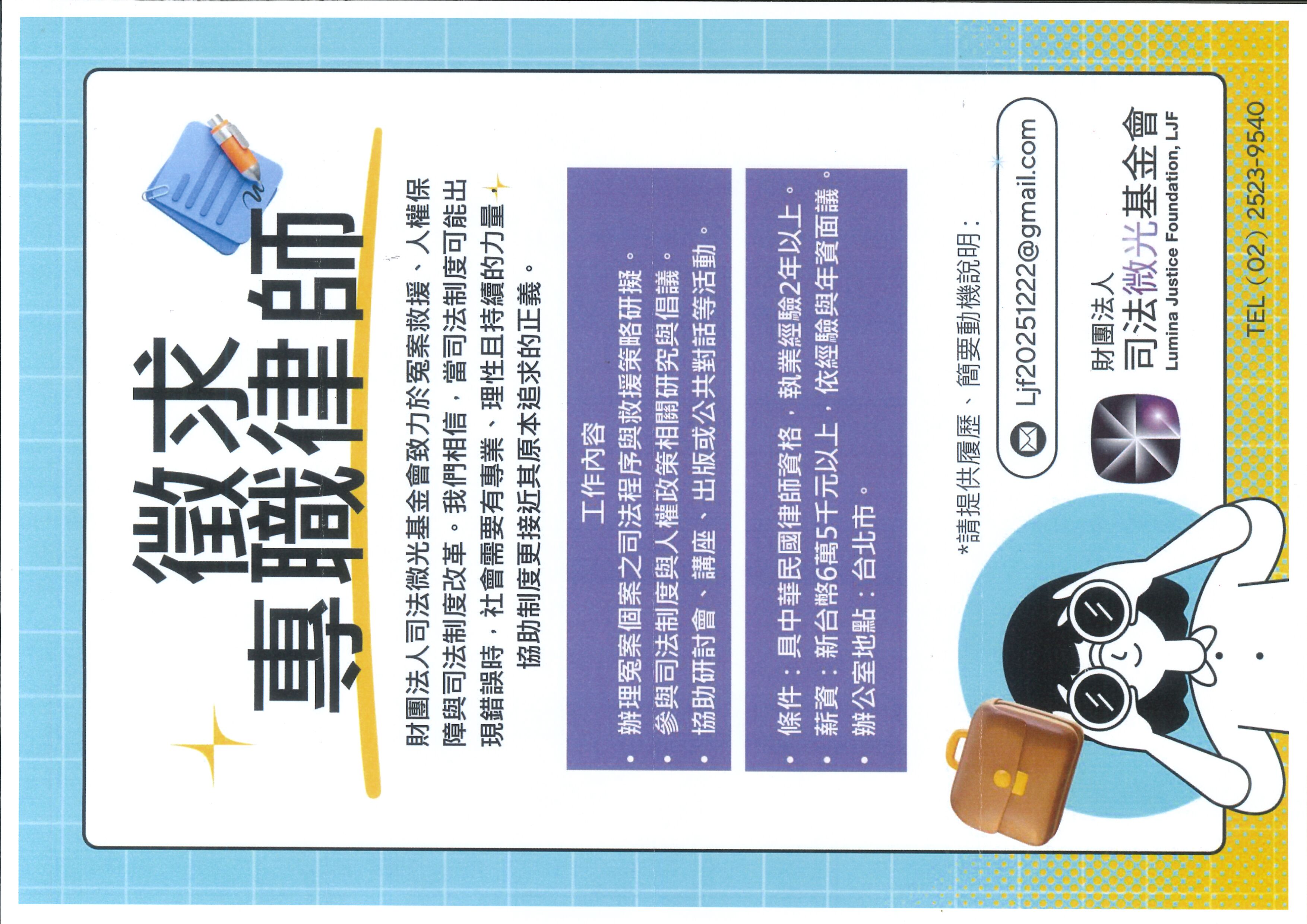 轉知~財團法人司法微光基金會徵求專職律師啟事。